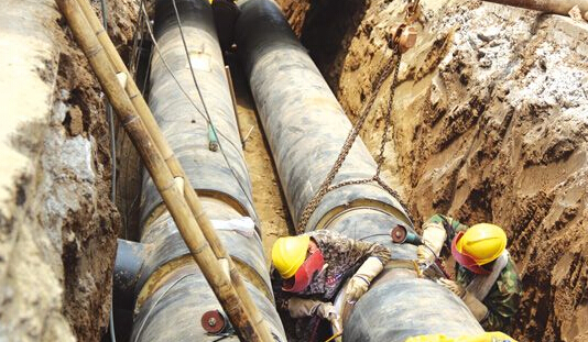 圖為施工人員利用微型手拉葫蘆進行天然氣管道鋪設作業(yè)集中供熱工...